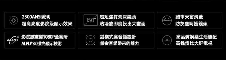1080P全高清物理分辨率,支持4K硬解碼 亮度: 2200ANSI流明 30000小時光源壽命 梯形校正範圍:±45° 技術:主動快門式3D技術